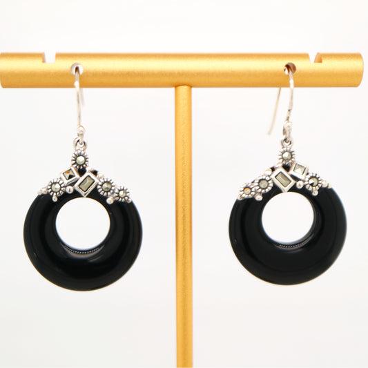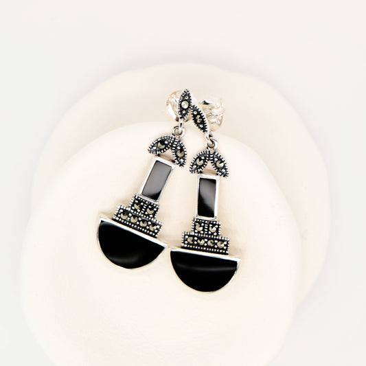 Vendor:Vintage CollectionArt deco dangle earrings with green agate and marcasite in sterling silver