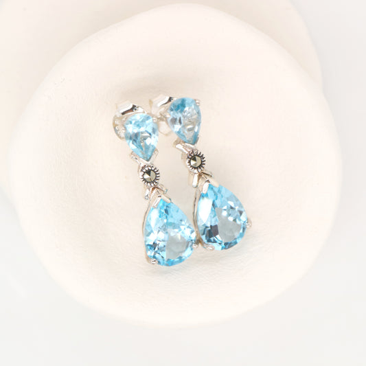 Stud earrings with Checkerboard cut black onyx, marcasite in sterling silver