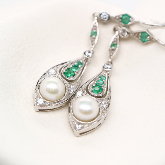 Vendor:Heirloom CollectionDangle earrings with fresh water pearl, emerald and diamond in 9k white gold