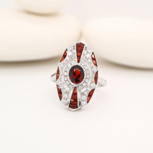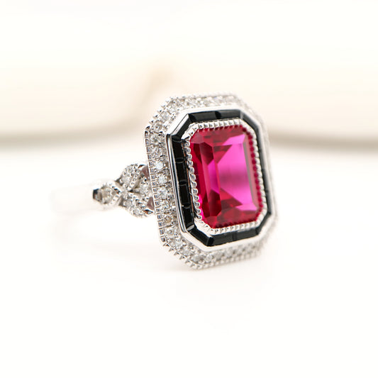 Art deco ring with laboratory grown ruby, onyx and cz halo in sterling silver
