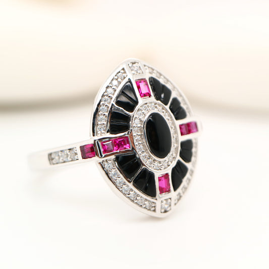 Art deco style earrings with carnelian, onyx and diamond in 9k white gold