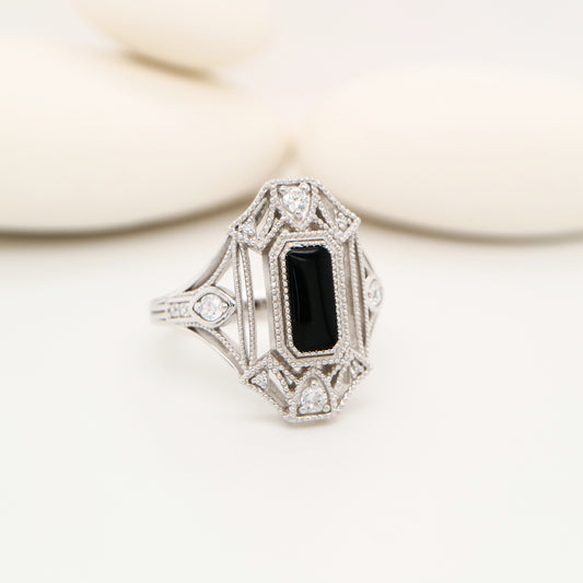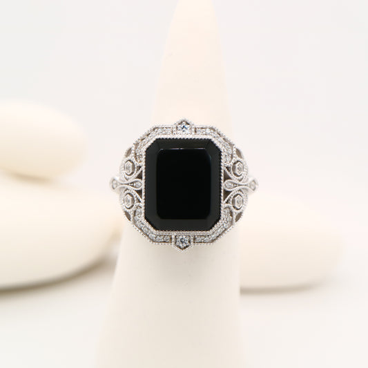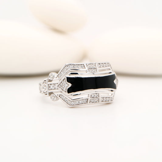 Art deco fan dangle earrings with natural diamond and onyx in 9k white gold