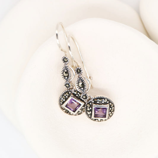 Vendor:Vintage CollectionArt deco princess cut amethyst drop earrings with marcasite in sterling silver