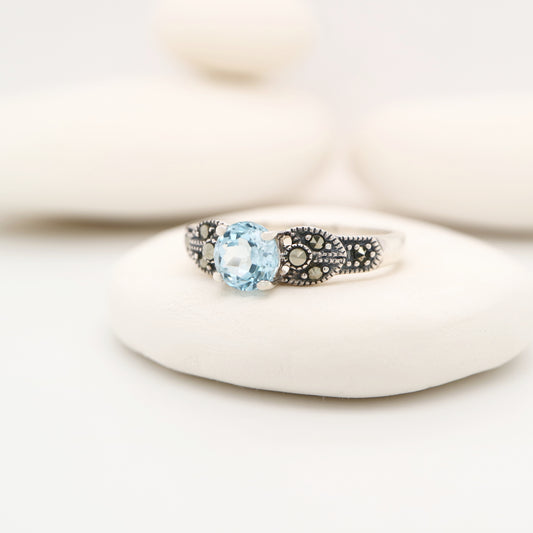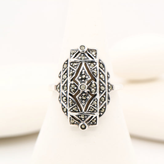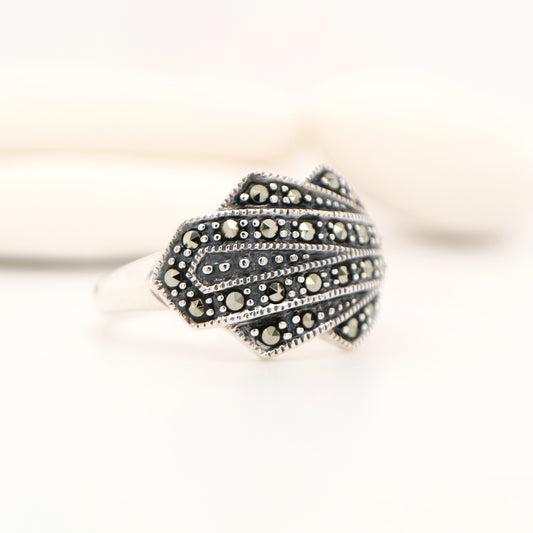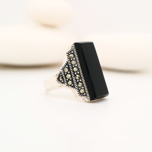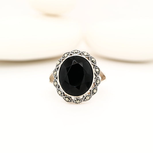 Vendor:Vintage CollectionArt deco style black onyx ring with marcasite in scalloped edge in sterling silver