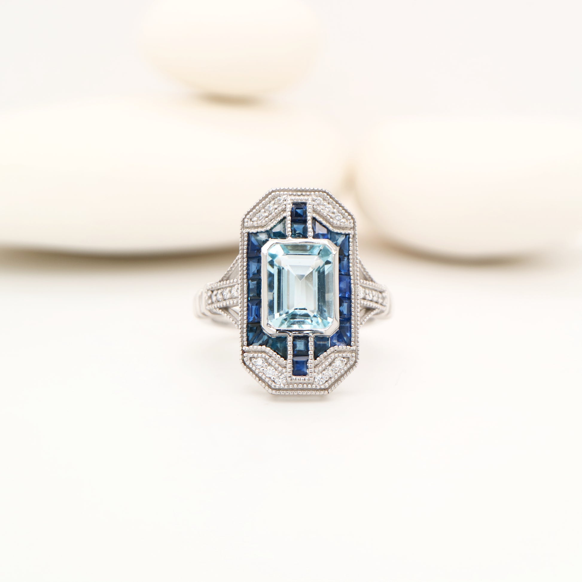 Art deco aquamarine cocktail ring with sapphire halo in white gold