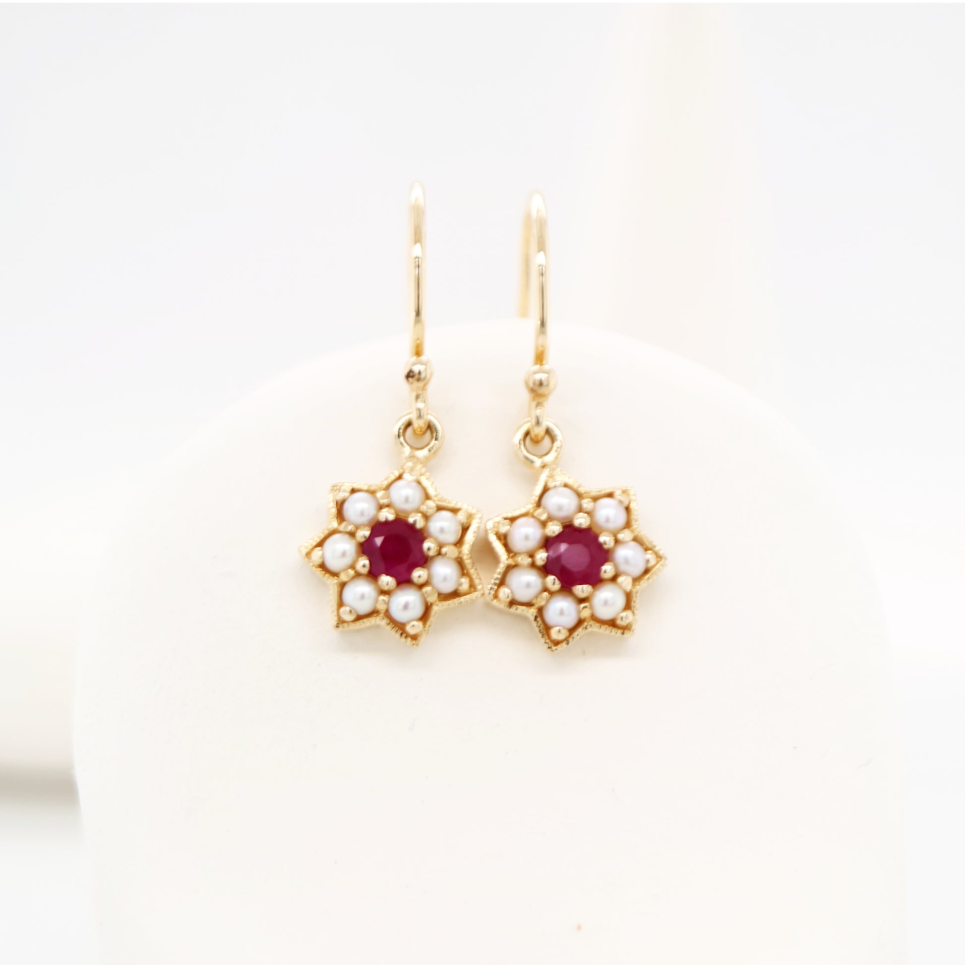 Star earring with Ruby and Pearl in 9k Yellow gold