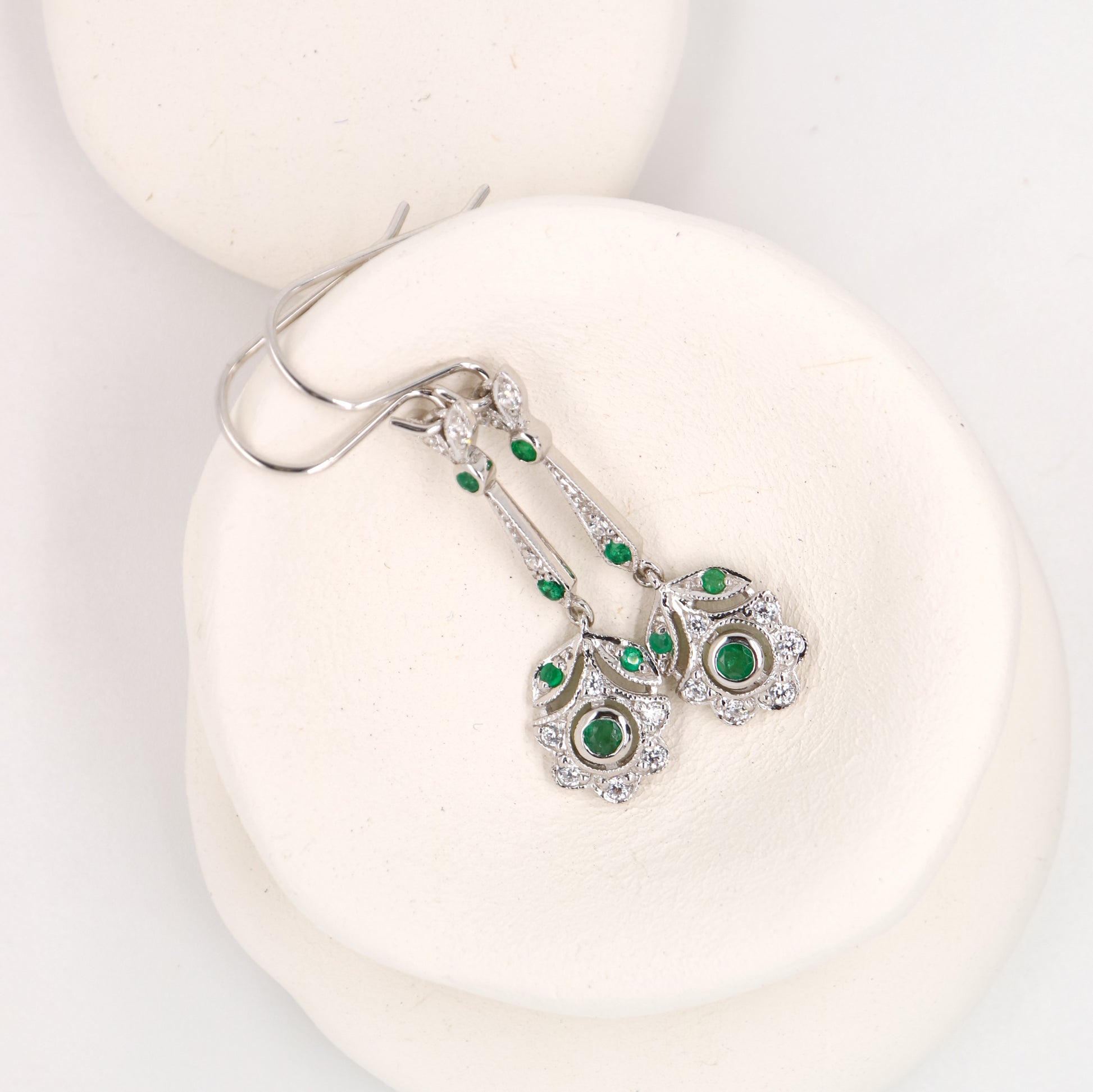 Floral drop earrings with laboratory grown emerald and cz in sterling silver