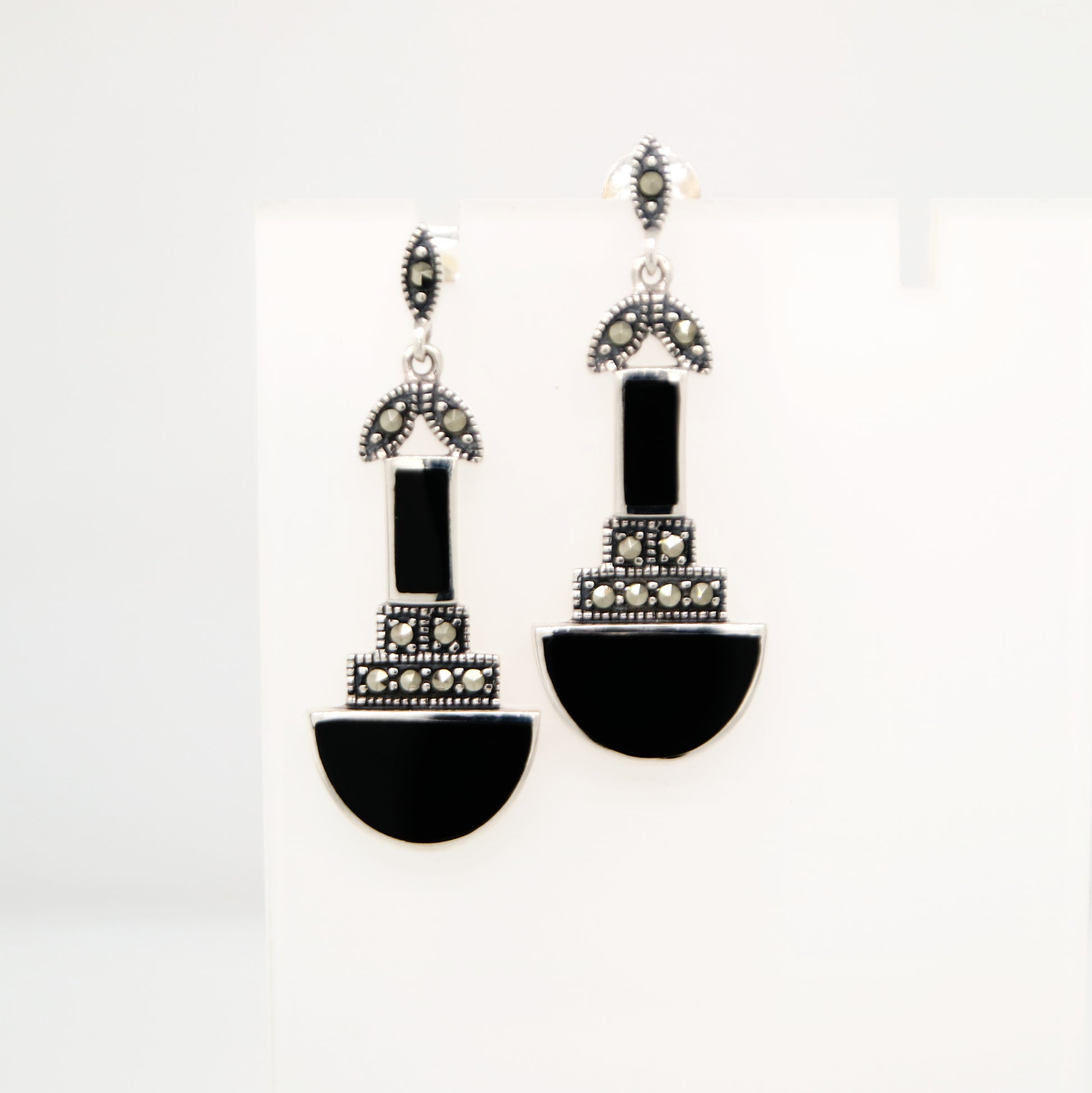 Art deco drop earrings with black onyx and marcasite in sterling silver