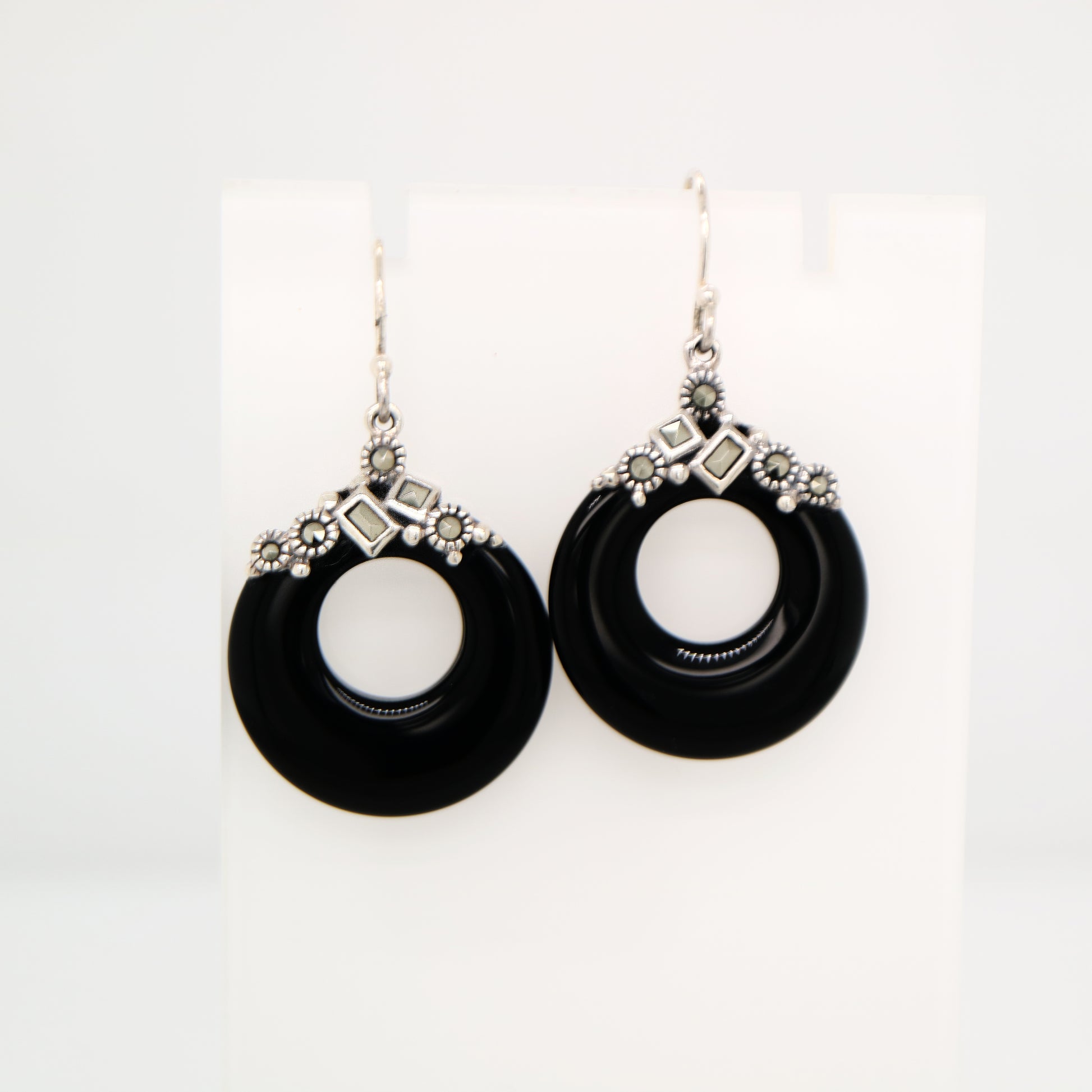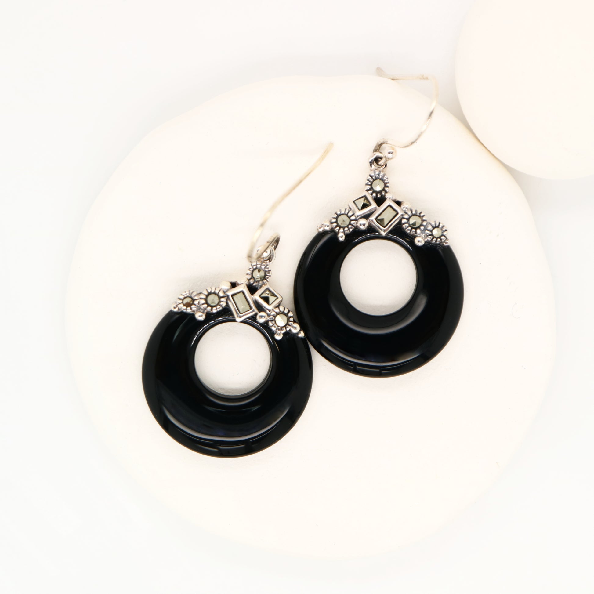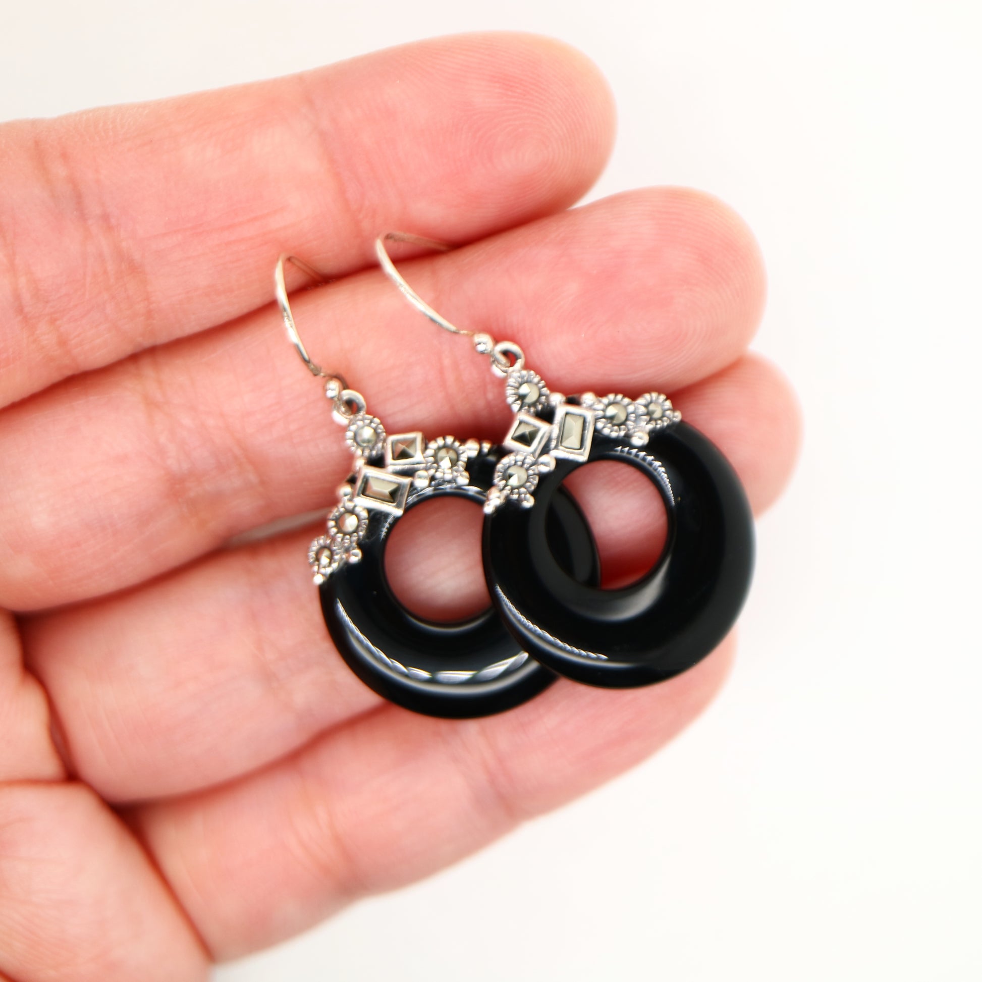 Art deco onyx loop earrings with marcasite in sterling silver