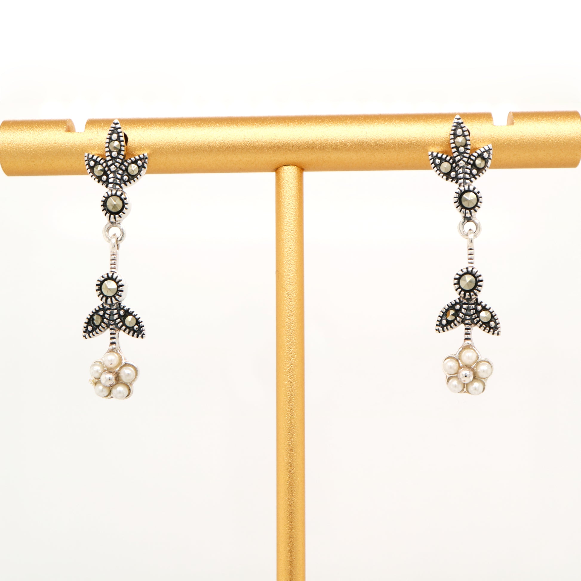 Freshwater pearl daisy drop earrings with marcasite in sterling silver