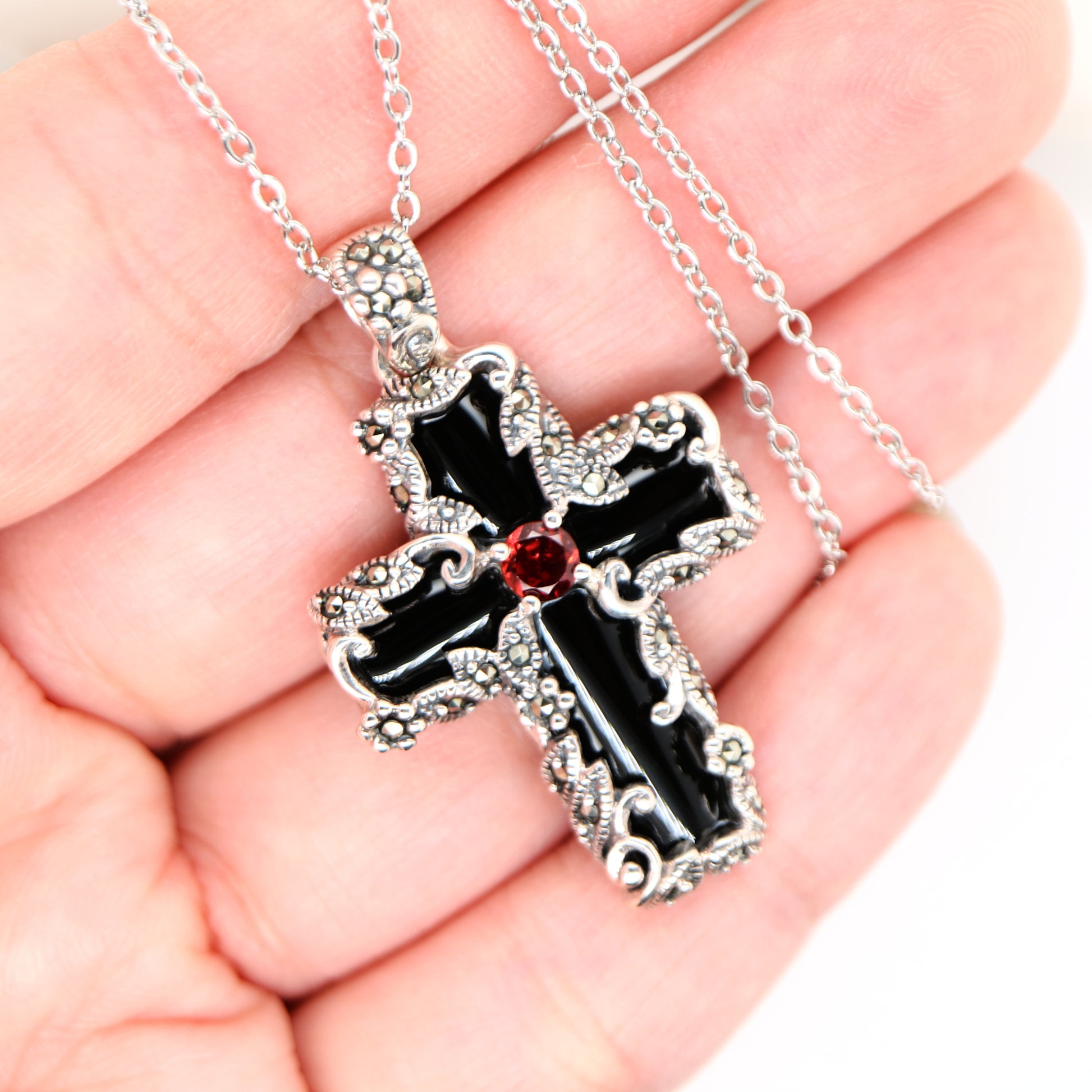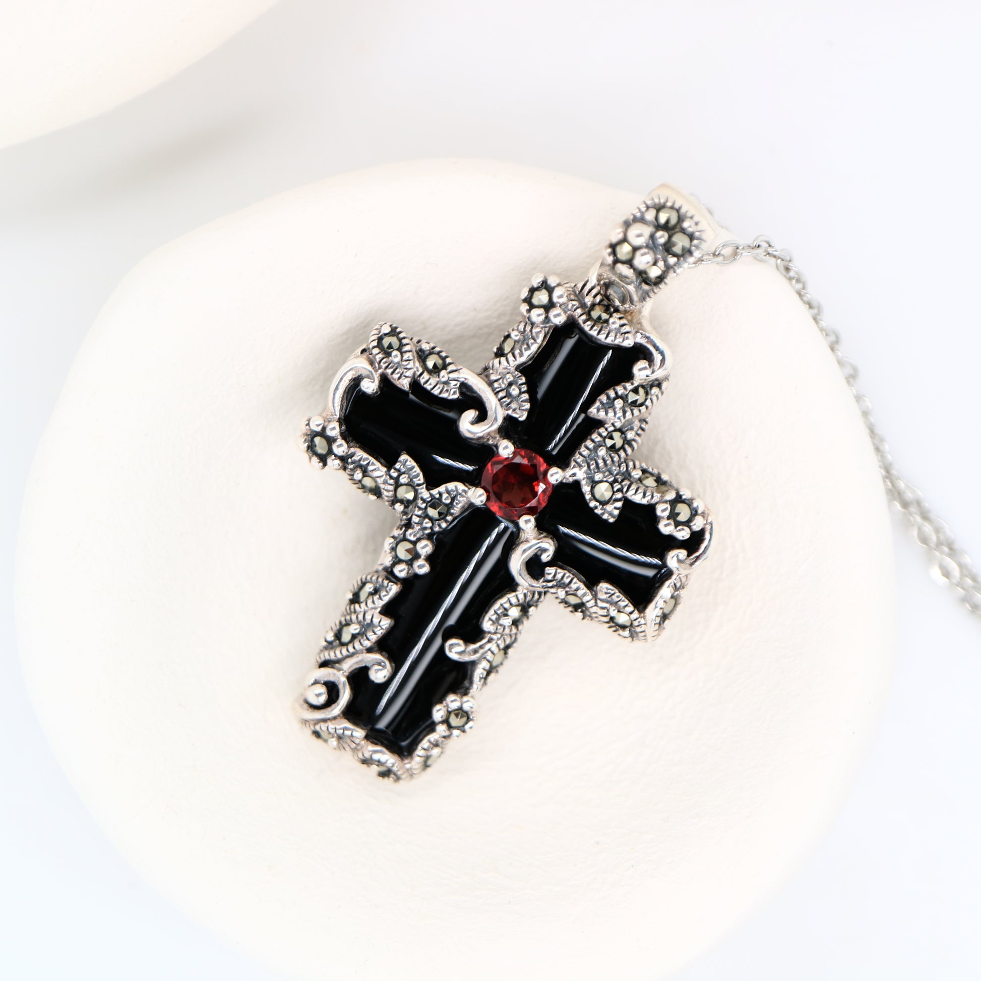Gothic Cross Pendant in Onyx Marcasite Garnet and Sterling Silver