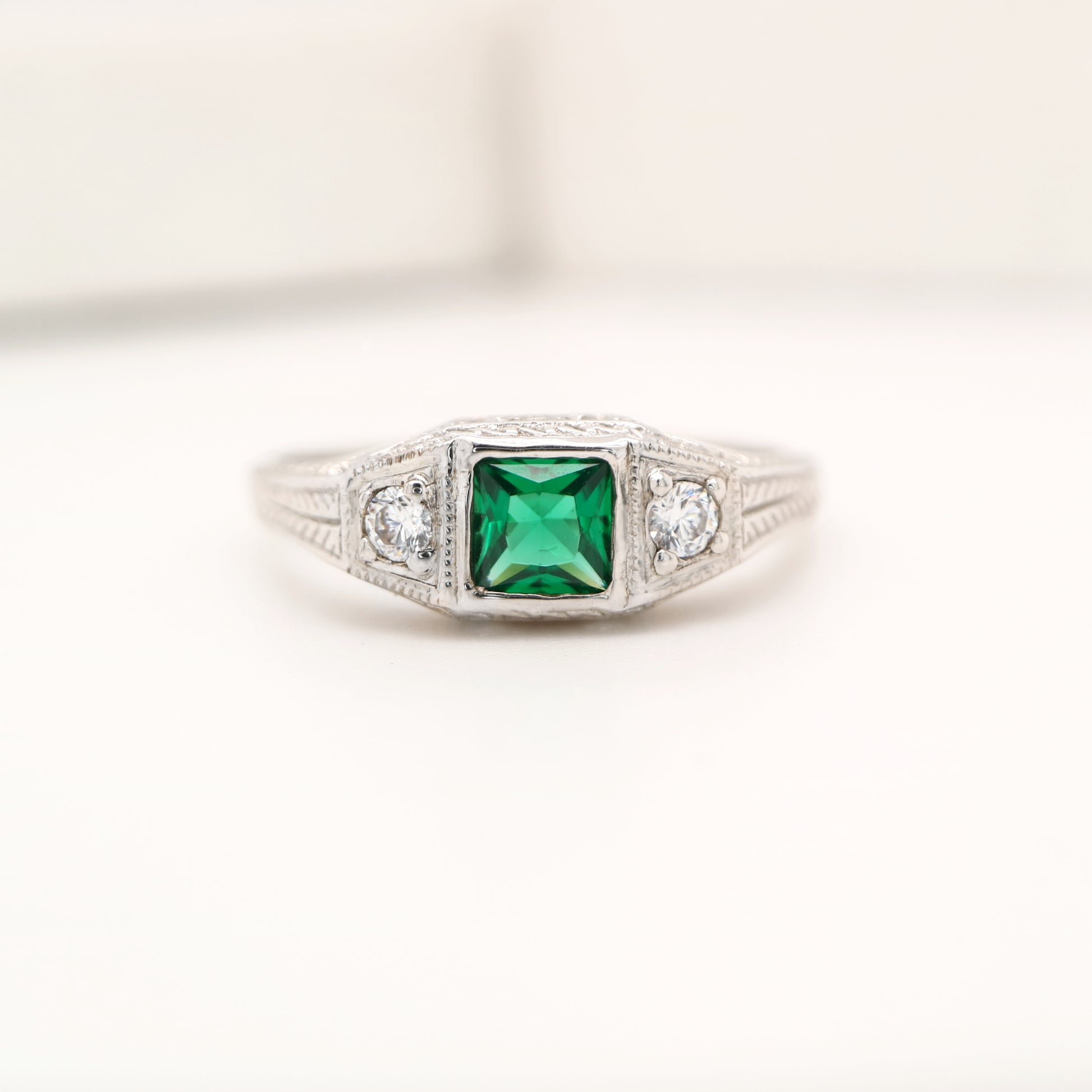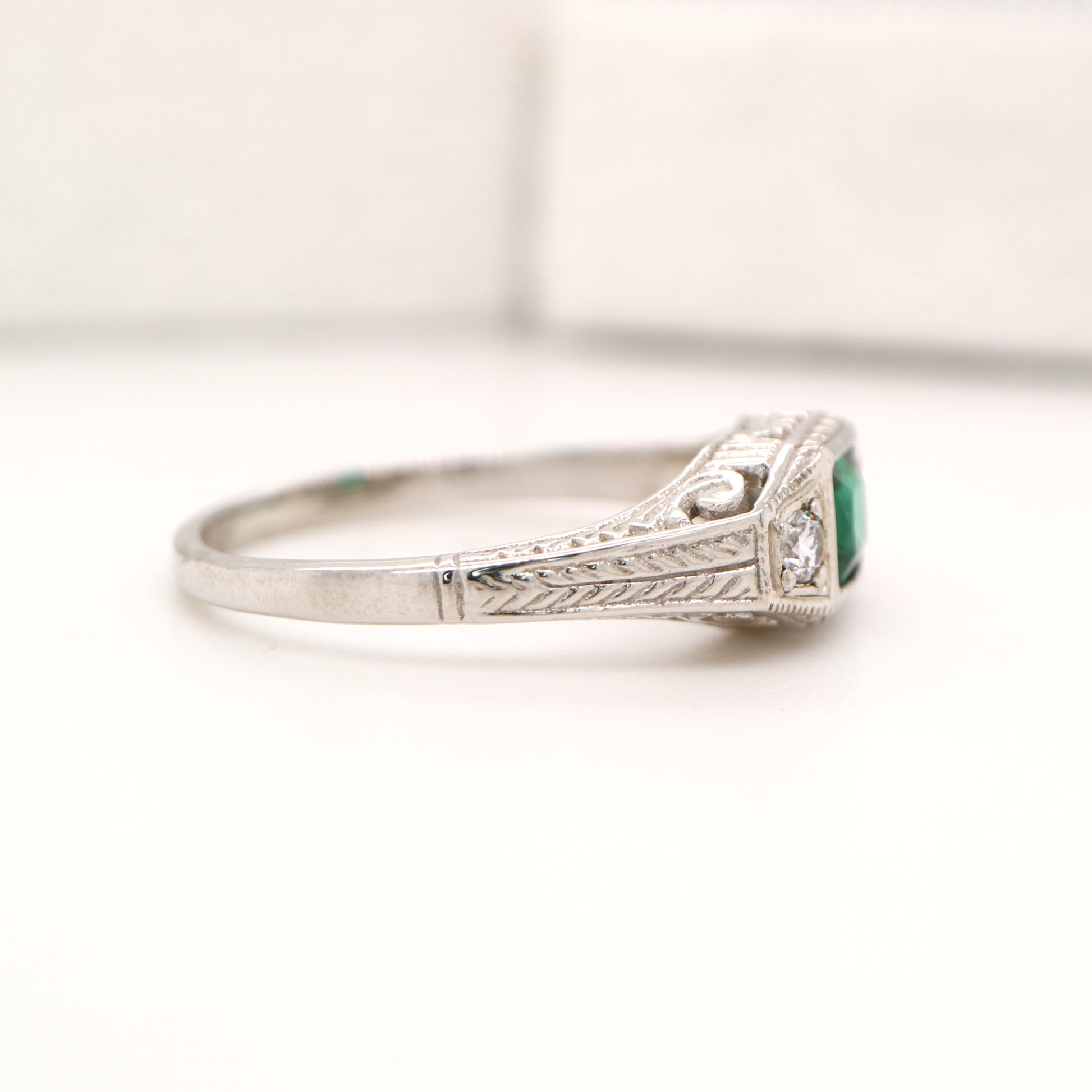 Art deco 9k white gold ring with center emerald and shoulder diamonds